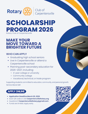 The Rotary Club of Carpentersville is pleased to offer scholarships to graduating high school seniors who are committed to continuing their education and contributing to their community.